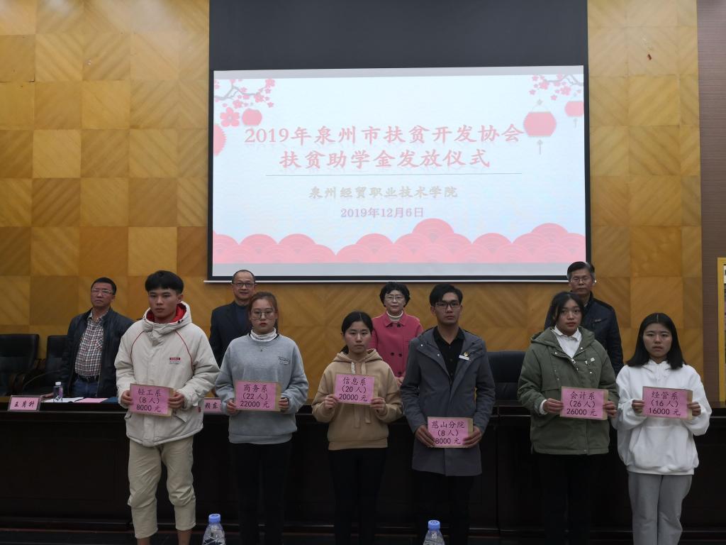 2019年12月6日下午,我院在学术报告厅举行2019年泉州市扶贫开发协会扶贫助学金发放仪式。学院党委书记周文心,党委委员、副院长赖东升,党委委员、副院长花文苍,学生处、财务科、各系学生工作负责人、全体受助学生参加仪式,仪式由学生处处长王月升主持。