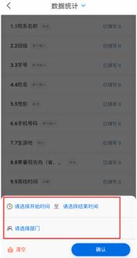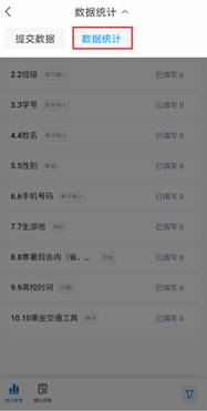 1辅导员登陆学习通,进入“寒暑假去向”模块。默认进入“提交数据”界面,点击“提交数据”出现下拉菜单,点击右下角漏斗处开启筛选功能,选择相应的时间和部门,即可设置统计范围。