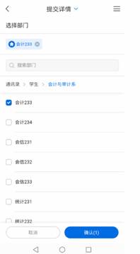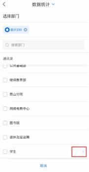 选定开始时间为“2025-06-23 00:00:00”,结束时间为“2025-06-27 23:59:59”点击下边的“请选择部门”按钮,下滑选择“学生”,弹出选择二级学院和班级按钮,辅导员可以勾选自己带的班级(可以同时选中1个以上班级),点击右上角“完成”按钮,然后点击“确认”。