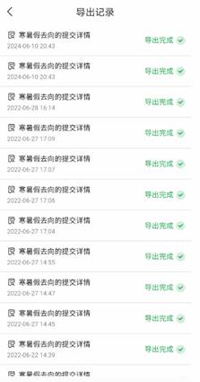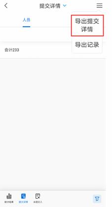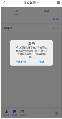如所有学生已经填写完毕,切换到“提交详情”界面后,辅导员选中开始时间、结束时间和班级,此时点击右上角三条线,弹出窗口中选中“导出提交详情”,系统会提示“成功发起数据导出,导出的过程需要一些时间,您可以前往导出记录查看并下载统计结果”,点击确定,之后在“导出记录”中会显示该结果已经“导出完成”后,点击相应的记录,点击右上角的箭头按钮,可以转发文件至QQ或其他应用(可以在“更多”按钮中找到更多应用)通过电脑端下载下来。