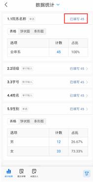 系统将显示所勾选班级的填写情况。点击左上角“已填写”将显示已完成表单的学生名字,点击对应学生名字右侧箭头即可了解学生填写情况。点击左下角“未提交人”,可以查看未填写学生名单,催促学生填写。
