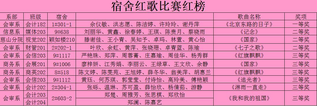 本次宿舍红歌大赛活动的成功举办,激发了同学们的集体荣誉感和团队合作意识,营造了团结、求实、积极、进取的宿舍文化氛围,同学们用歌唱诠释了青春与理想同行,反映了当代大学生积极向上的精神风貌。(易班新闻部)