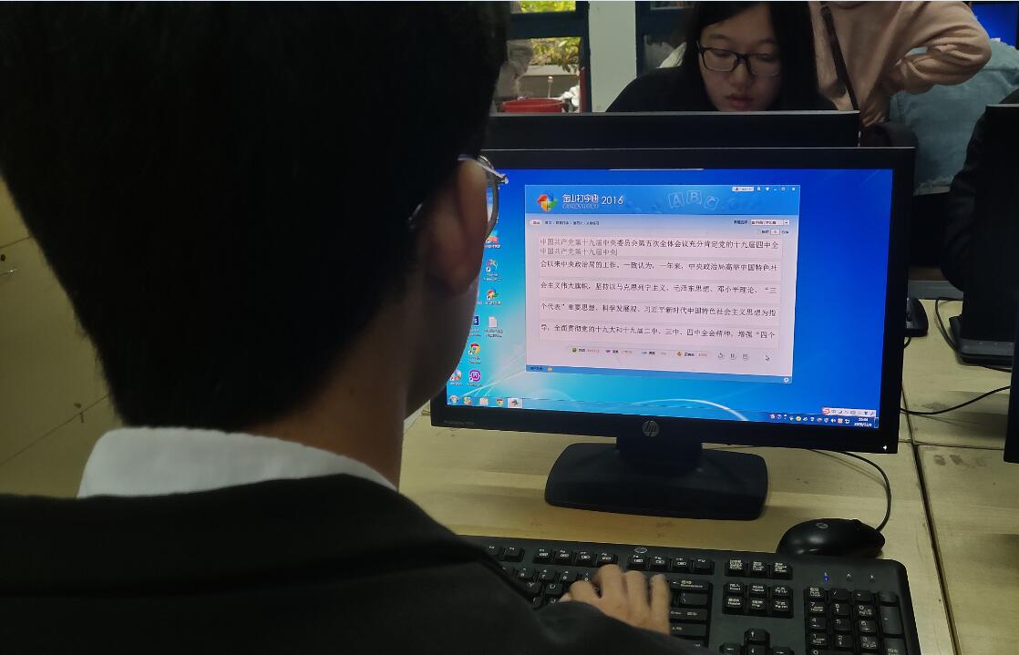 此次比赛使用金山打字通软件,主要测试选手中文打字速度。易班工作站将事先在软件中导入同一篇文章。文章为中国共产党第十九届中央委员会第五次全体会议公报相关内容。本次比赛参赛选手达200余人,每位选手放任自己的十指在键盘上敲击,键盘敲击的声音在机房中此起彼伏。易班的工作人员们也毫不懈怠,他们积极配合,共同维护比赛现场的秩序,记录好每一位参赛选手的成绩。