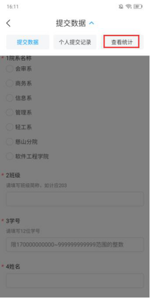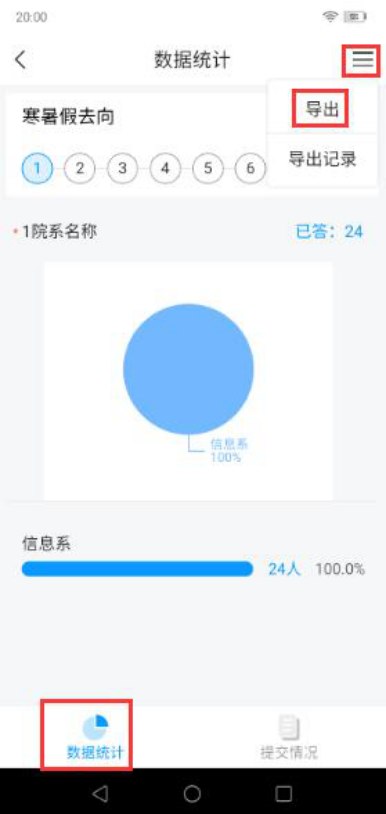 1辅导员登陆学习通,进入“寒暑假去向”模块。默认进入“提交数据”界面,点击“提交数据”出现下拉菜单,点击右侧“查看统计”,选择相应的时间和部门,即可设置统计范围。