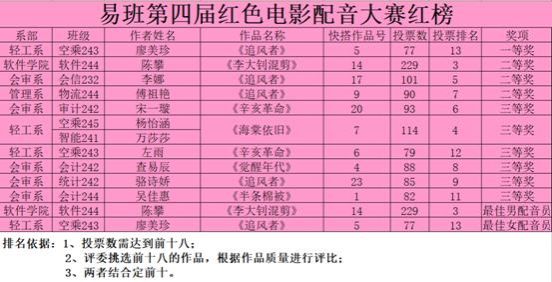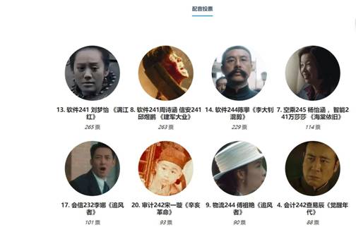 本次比赛以经典红色电影为主题,选取了《觉醒年代》、《追风者》、《辛亥革命》、《建军大业》等多部脍炙人口的作品,鼓励学生们通过配音的形式,表达对英雄人物及其事迹的理解和感悟。本次活动全院共有76份作品参赛。参赛选手们纷纷展示了自己的配音作品,或激情澎湃,或细腻动人,令人耳目一新。评委们结合技术水平、情感表达和作品创意等多个维度进行了评分。根据易班快搭投票结果,前20名作品交由评委打分,最终评出一等奖1名、二等奖3名、三等奖6名,最佳男配音员和最佳女配音员各1名。最终,来自空乘243班的的廖美珍同学以其精彩的配音表现获得了比赛的冠军。