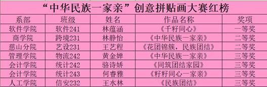 本次大赛自启动报名以来,便受到了广泛关注。同学们积极发挥自己的想象力与创造力,精心挑选材料,将象征不同民族特色的元素巧妙融合。有的同学用以折纸和绘画拼贴相结合的形式,通过独特的布局呈现出一幅生动的画面;有的同学则利用废旧纸张和自然植物,如树叶、花瓣等,拼贴出寓意民族大团结的花朵盛开图景。评委从作品的主题契合度、创意性、技术技巧等多个维度进行严格评审。经过激烈的角逐,最终评选出一等奖1名、二等奖2名、三等奖4名。