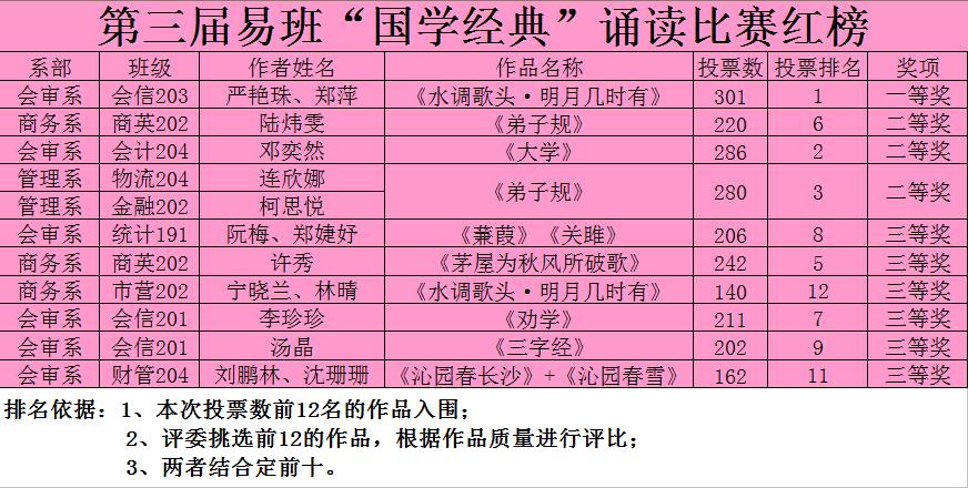 此次活动采取录制参赛视频在线上展示的方式进行。全院共有100多名学生积极报名参赛,参赛作品有字字珠玑的《三字经》、《弟子规》等传统国学,有唐代浪漫主义诗人李白的《将进酒》、宋代诗人苏轼的《水调歌头·明月几时有》等古典诗词,还有充满激情的《沁园春·雪》、《沁园春·长沙》等爱国诗篇。经易班发展中心初选,有18个作品入围快搭投票,评委结合快搭投票排名和参赛作品质量选出一二三等奖。