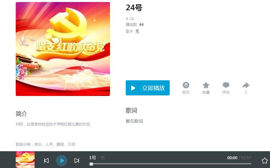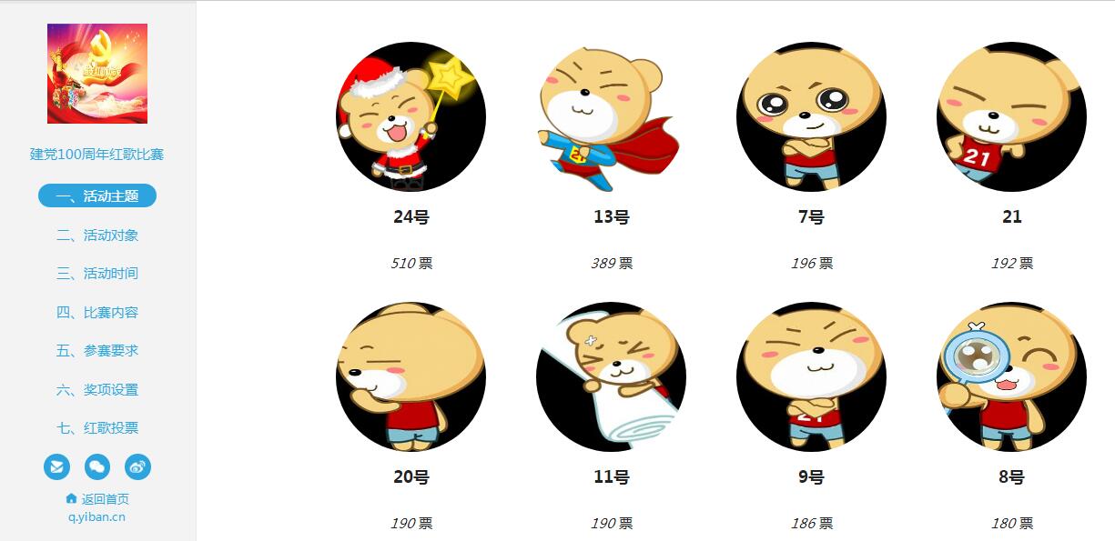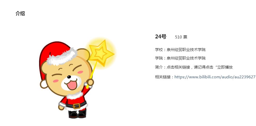 本次比赛采用线上方式,参赛选手从《100首红歌经典曲目》自选曲目,使用CooleditAdobe Audition等电脑软件或是全民K歌等手机软件进行录唱,向我院易班工作站提交时长不少于3分钟,大小不超过 10MMP3文件,院易班工作站依据参赛作品质量和作品规范等对作品进行初步筛选后将作品上传到易班网进行网络投票,2021415-2021418日我院师生在网上进行投票,投票排名前15名的作品交由评委打分,评委根据作品质量选出一二三等奖。