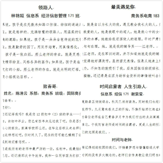 99-9月30我院举办了“感念师恩”征文比赛,各年级在校生围绕“感念师恩”主题,用自己的笔表达对老师们的敬意和感激之情。同学们真诚的叙述让大家感受到在我们身边有一批非常优秀的老师,他们对学生的爱与关怀,他们人格的魅力已深深影响或者根植在了学生心中。这些文章文风或华丽或朴实,字里行间流露着感恩之情,展现了同学们的风情才貌,也让大家对师生关系有了更深刻的认识。
